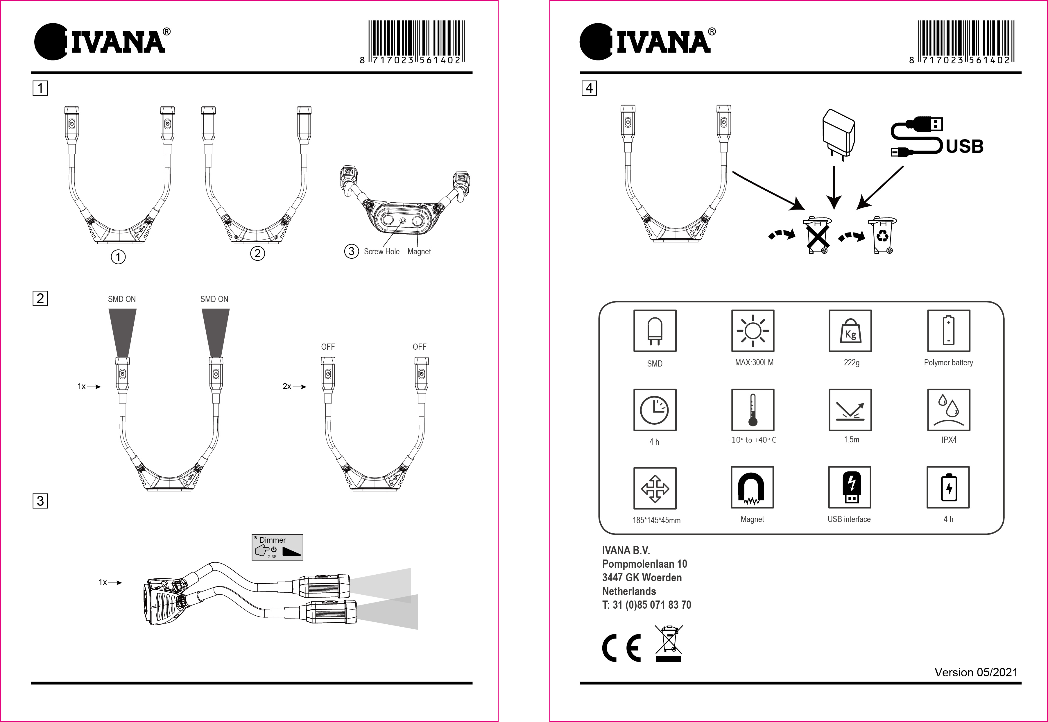 De Ivana neklamp van 2x 150 lumen gaat tot 6 uur mee op één accu en wordt geleverd inclusief oplader en snoer. De lamp is voorzien van een magneet aan de achterkant en heeft een batterij indicator.